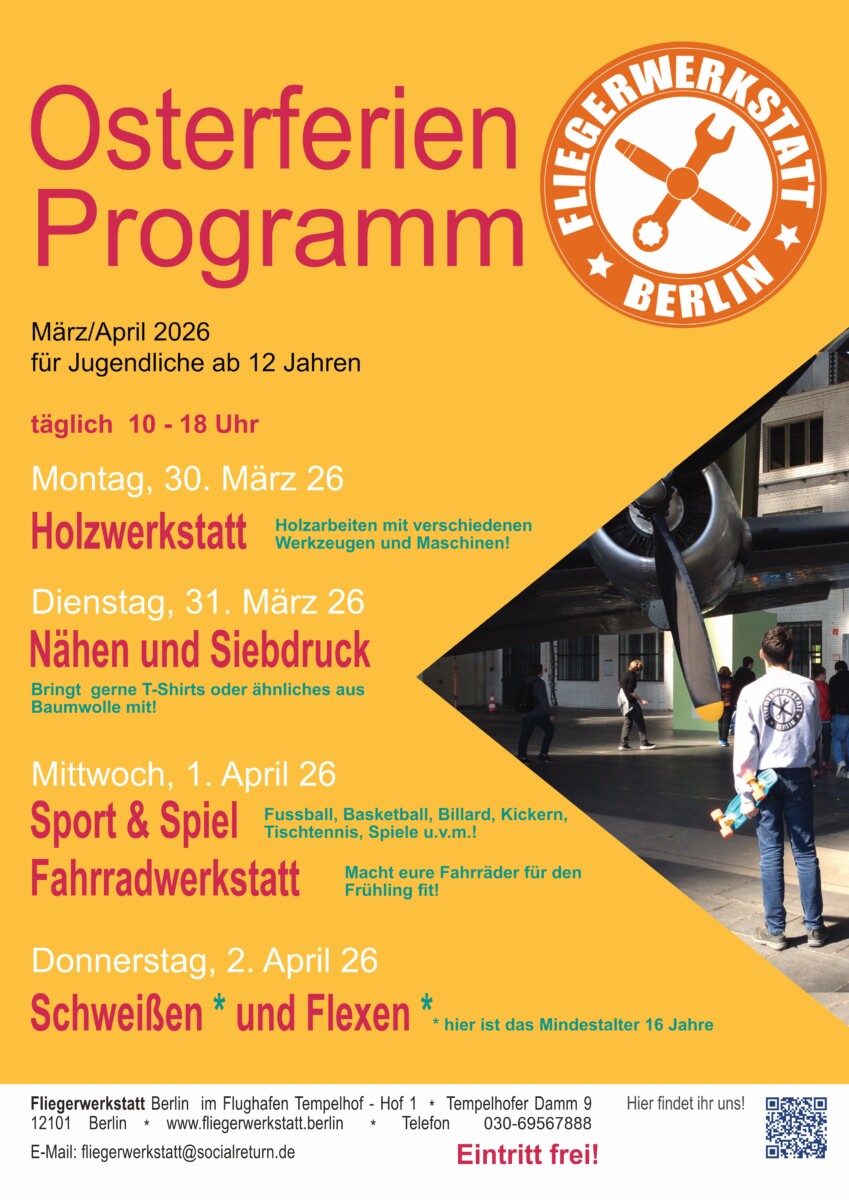 Osterferien in der Fliegerwerkstatt 16. März 2026 In der ersten Ferienwoche vor Ostern erwartet euch die Fliegerwerkstatt mit einem bunten Programm: